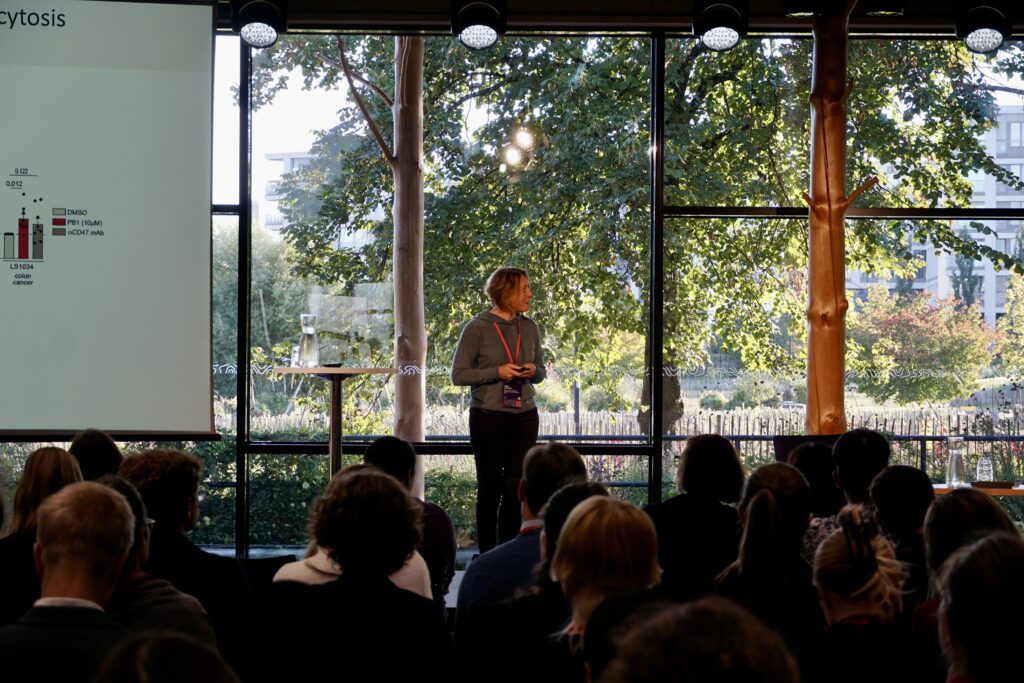 Elisa Oricchio from ISREC – Swiss Institute for Experimental Cancer Research, EPFL, presented work on the dual anti-tumour and pro-tumour roles of the immune system. By co-culturing macrophages with cancer cells and performing a drug screen, her team identified PB1 (pihahommia-booster 1) as a compound that enhances macrophage cytotoxicity against cancer cells. Mechanistically, PB1 targets HSD17B12, altering lipid metabolism specific to cancer cells. In addition, she showcased ex vivo drug screening tools using fresh tumour biopsies, where drug sensitivities closely matched clinical outcomes in 8 of 9 cases, highlighting the potential for advancing personalised medicine.